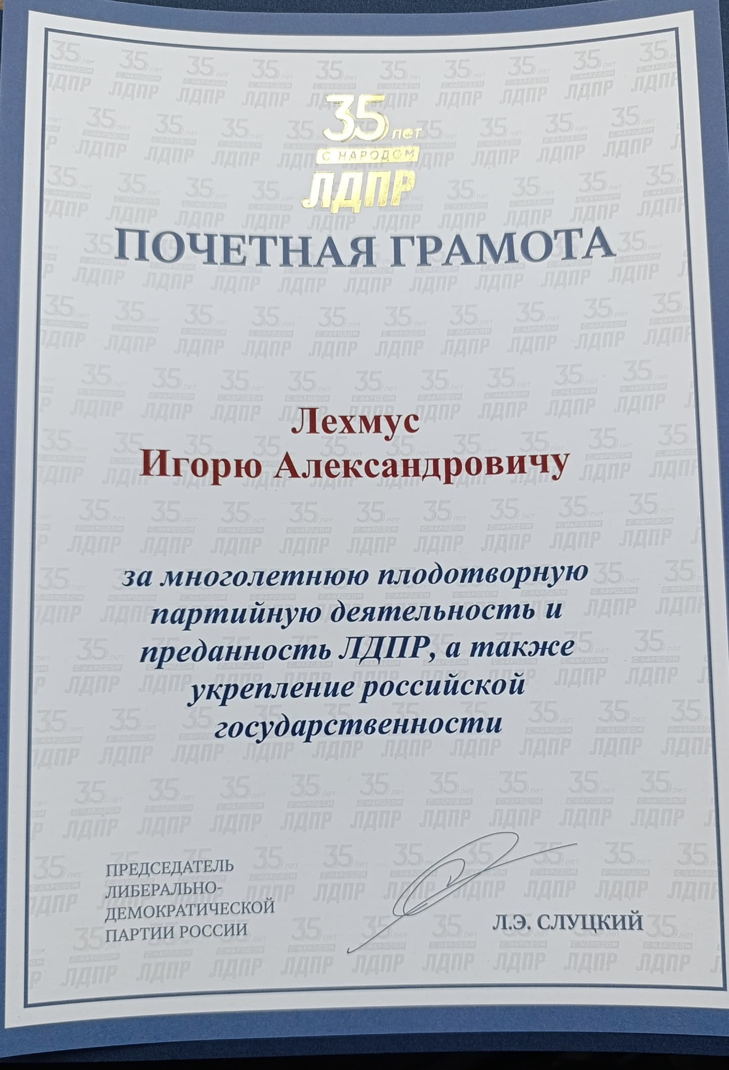 В связи с 35-летием ЛДПР, депутат Сахалинской областной Думы Виталий Баранов вручил почетные грамоты от имени Председателя партии Леонида Слуцкого