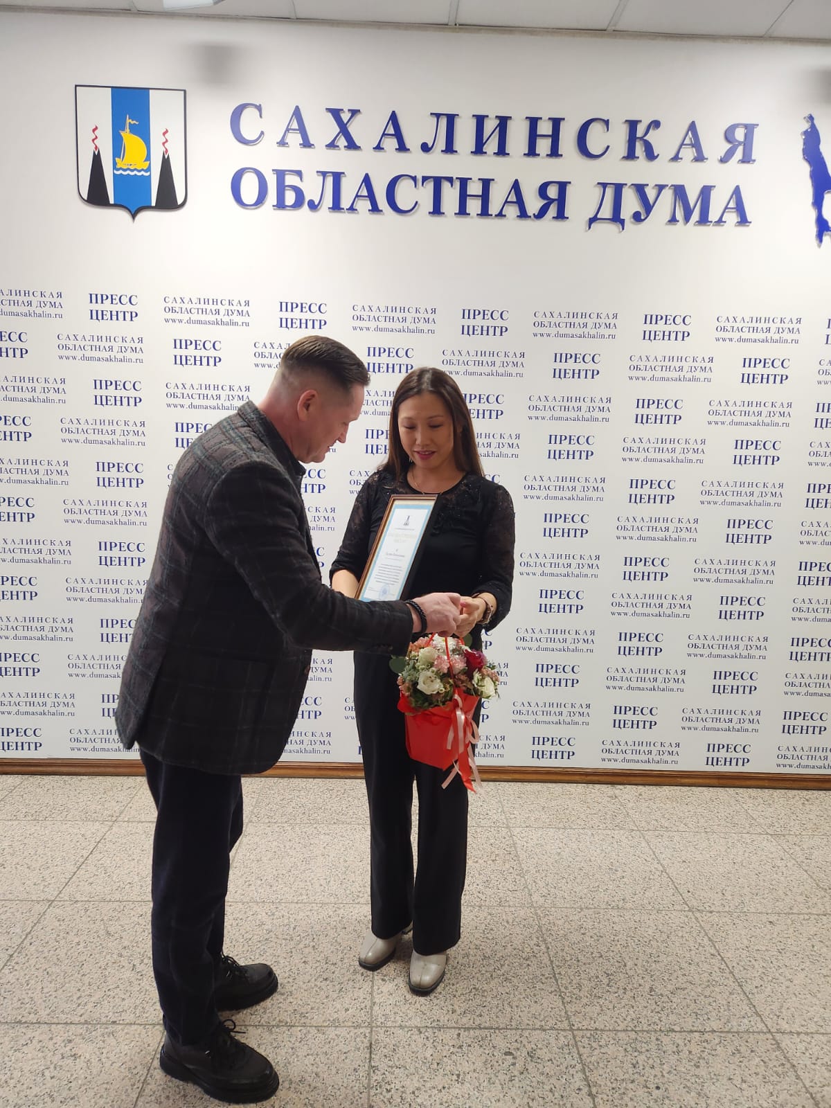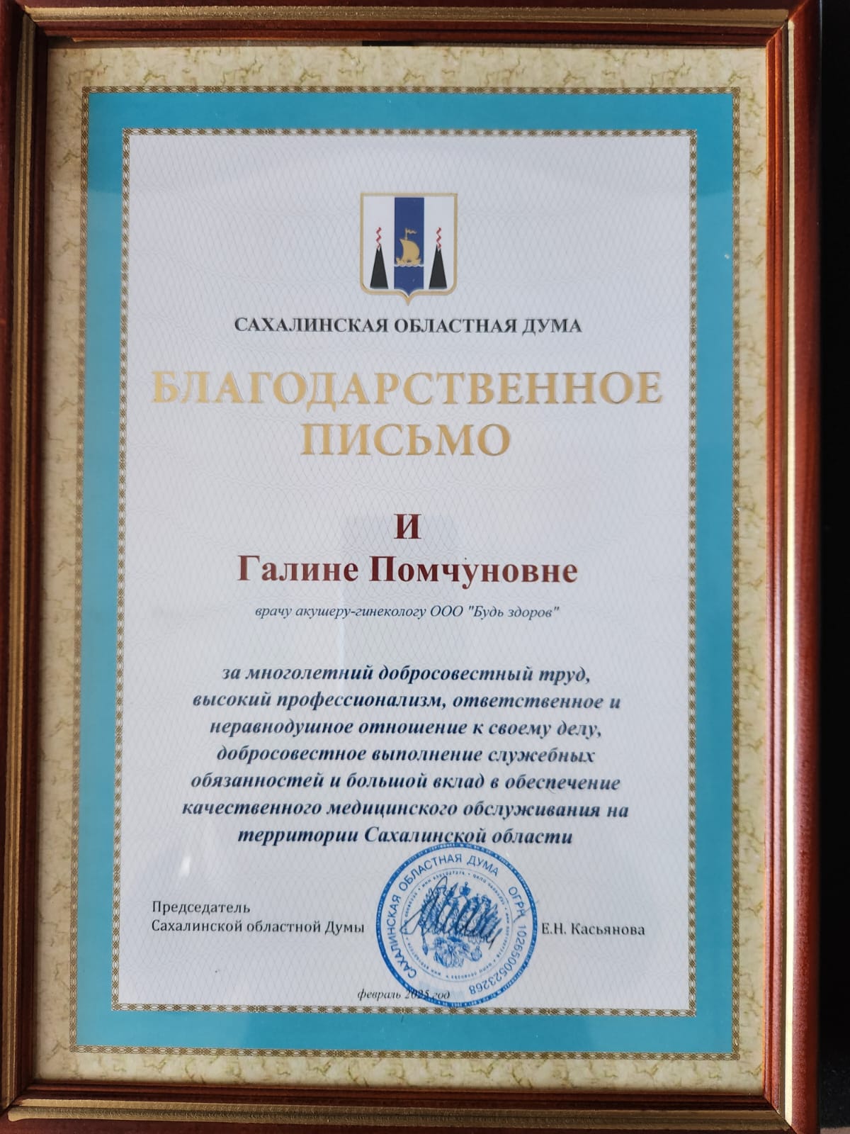 Депутат Сахалинской областной Думы от ЛДПР Виталий Баранов вручил благодарственное письмо врачу акушеру-гинекологу ООО «Будь здоров» Галине И