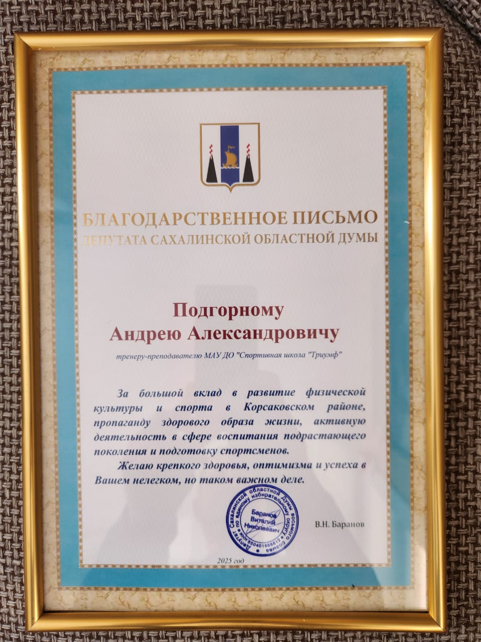 Депутат Сахалинской областной Думы от ЛДПР Виталий Баранов вручил благодарственное письмо тренеру и преподавателю МАУ ДО «Спортивная школа «Триумф» Андрею Подгорному