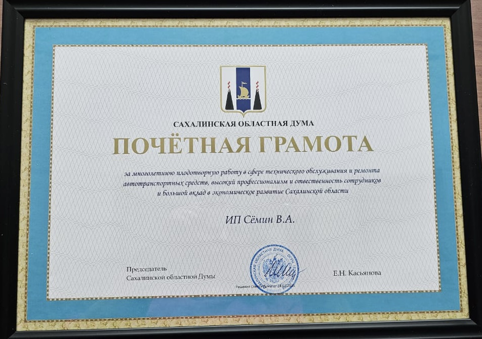 Награда была вручена за многолетнюю плодотворную работу в сфере технического обслуживания и ремонта автотранспортных средств. Виталий Баранов отметил высокий профессионализм и ответственность сотрудников предприятия, а также значительный вклад, который Сёмин внес в экономическое развитие региона. Это событие подчеркивает важность поддержки местного бизнеса и признание достижений предпринимателей, способствующих развитию экономики Сахалинской области.