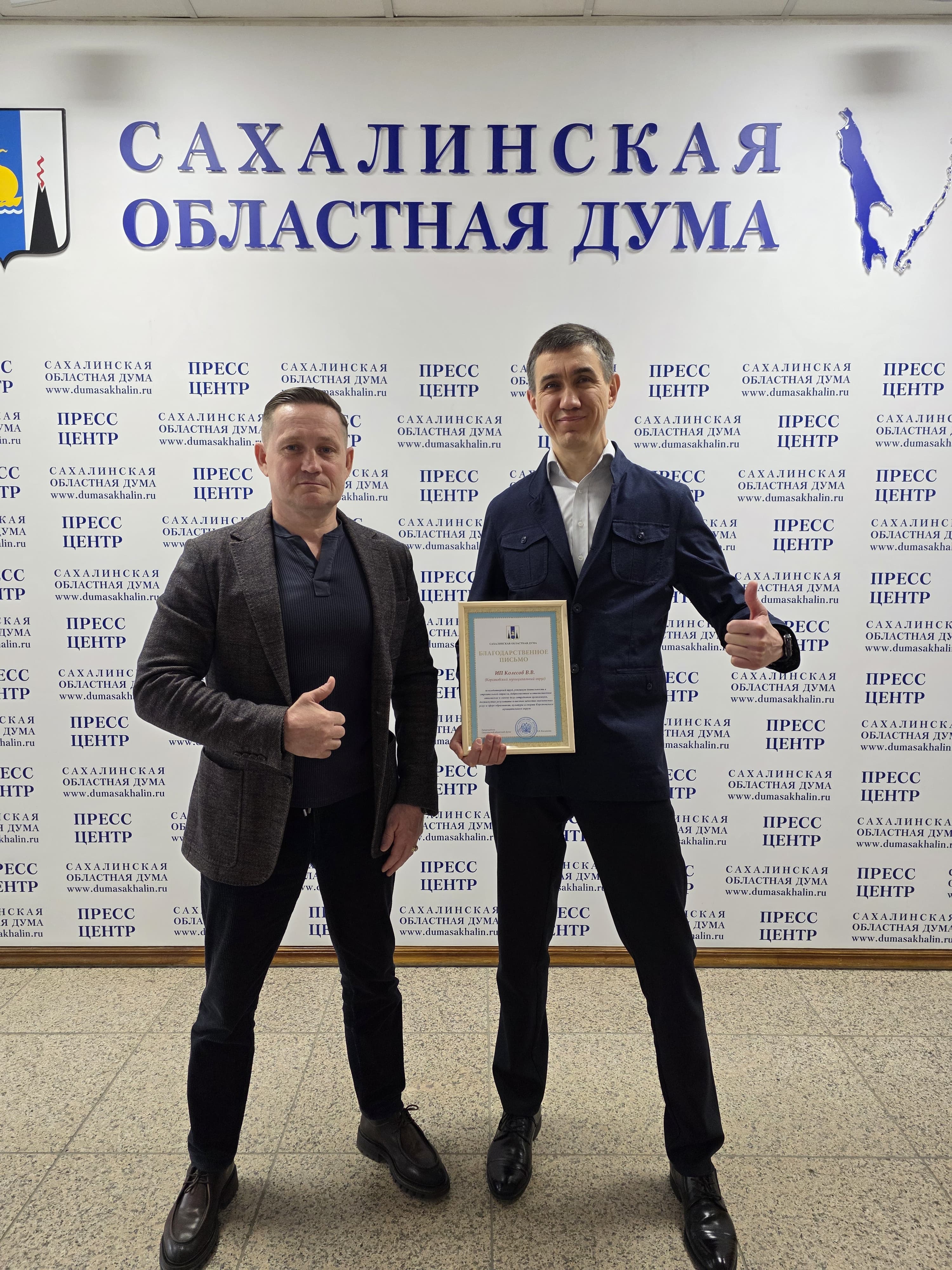 Депутат Сахалинской областной Думы от ЛДПР Виталий Баранов вручил благодарственное письмо индивидуальному предпринимателю Владимиру Владимировичу Колесову. Это признание стало символом плодотворного труда и успешной деятельности в строительной отрасли