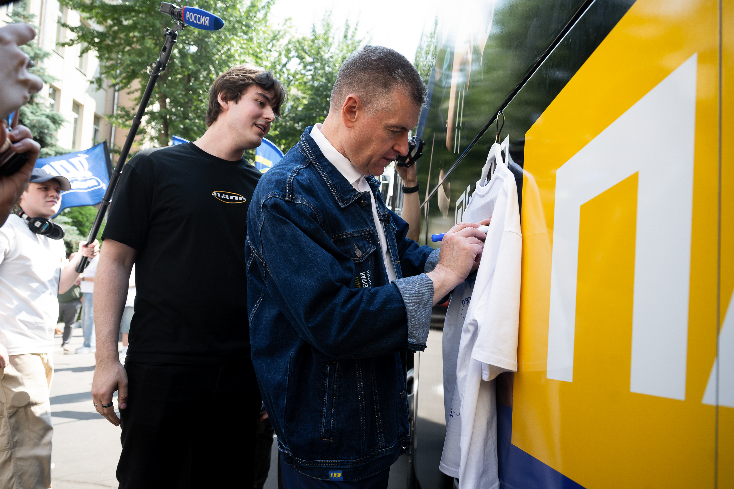 Также перед запуском автобуса Леонид Слуцкий дал молодым партийцам напутственные слова и поставил первую подпись на футболке с символикой ЛДПР, которую будут подписывать участники проекта во всех городах тура.